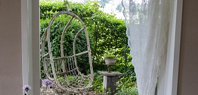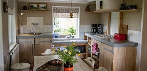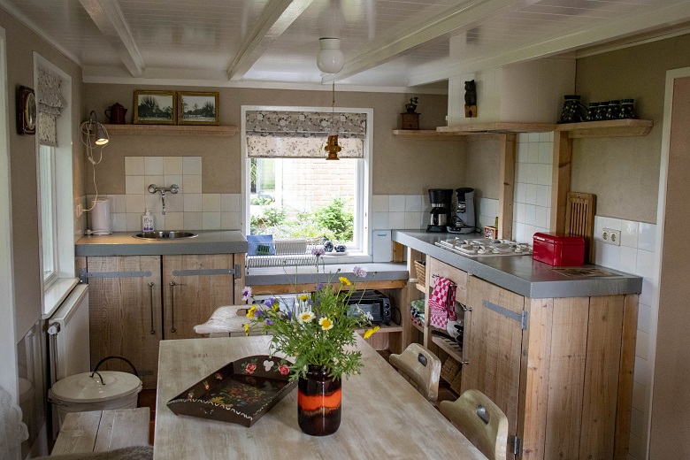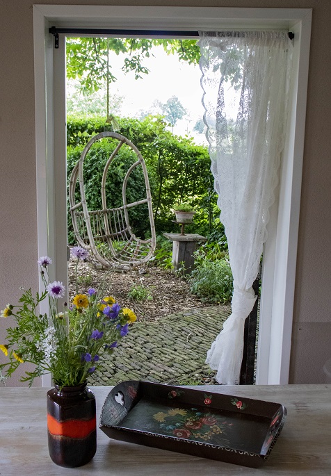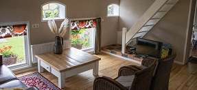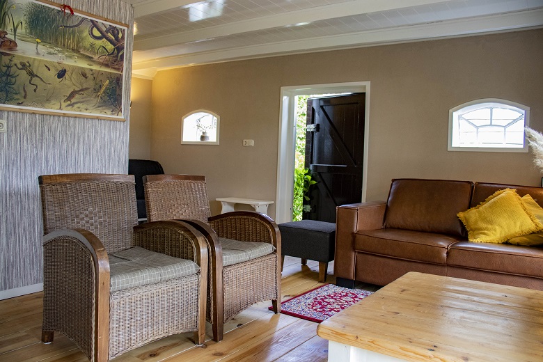 hier werden vroeger varkens gehouden, en is nu een ruime woonkamer met ouderwetse stalraampjes.